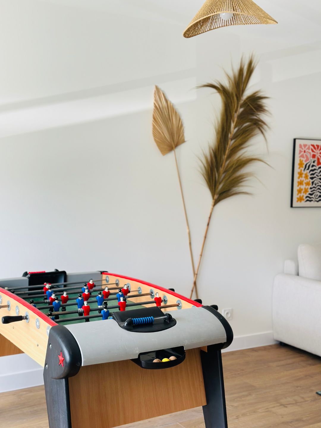 Dès l’entrée, vous découvrirez un vaste séjour lumineux, aménagé avec goût et équipé d’un babyfoot, idéal pour une une pause détente ou une soirée entre amis. La cuisine ouverte est entièrement équipée : four, plaques de cuisson, vaisselle, machine à café, tout y est pour cuisiner comme à la maison.